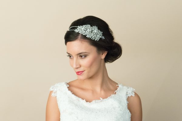 Luna is a real statement piece. Solitaire cut stones and sparkling crystal beads are heavily encrusted to create a gorgeous organic leaf design on the side of the flexible double headband decorated with tiny solitaires. This design has real vintage style appeal and would best complement wedding dresses with lace or antique styling.