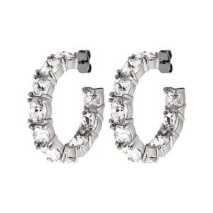 GRETIA is our new version of the large crystal set hoop earring. This version of Gretia is lavisly set with a combo of grande white crystals set on front . Made in polished brass,silver tone finish. Approx. 30 mm in diameter. Post is crafted in surgical steel. DANISH DESIGN – free of cadmium, lead and nickel. Simply stunning.