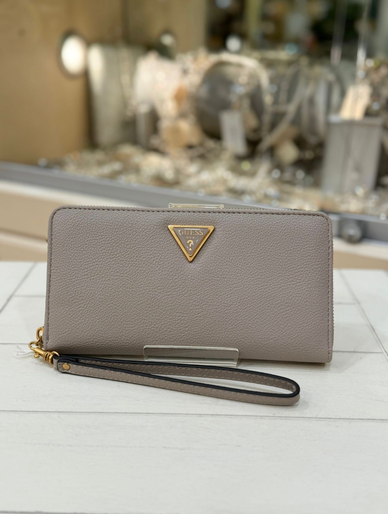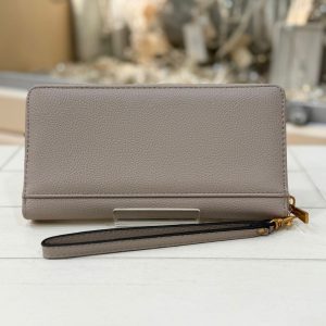 Credit card slots. Inside pocket with zip. Metal triangle logo on the front