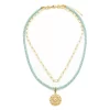 Aqua glass beads layered with gold plated paper clip chain with sunburst & stars charm. Length 39 + 44 + 5cm.
