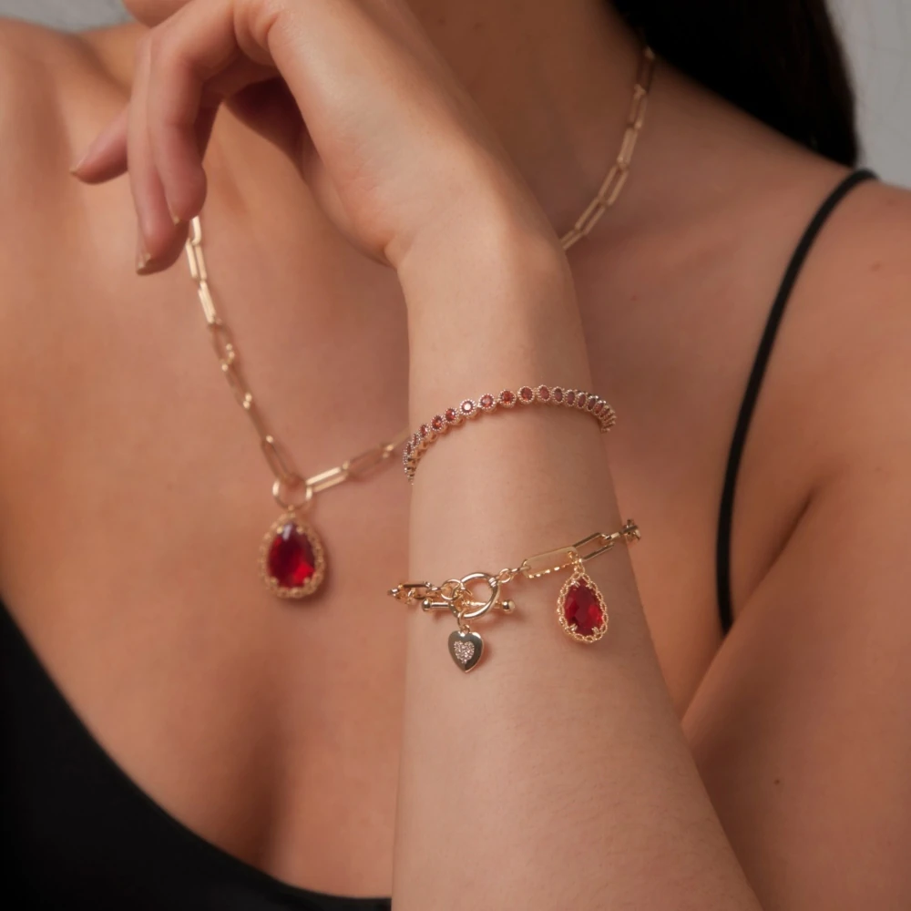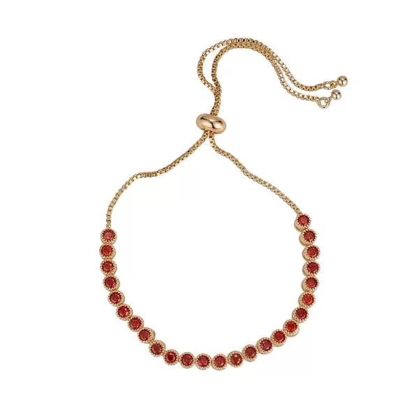 Tennis bracelet with garnet CZ stones & slider fastening. Gold plating.