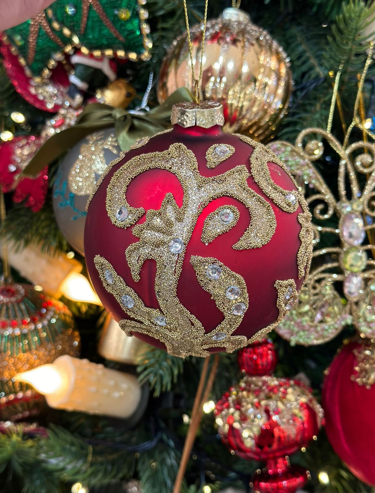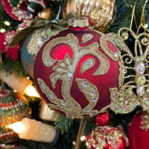 / Matte Red Bauble with Intricate Gold Beaded Pattern