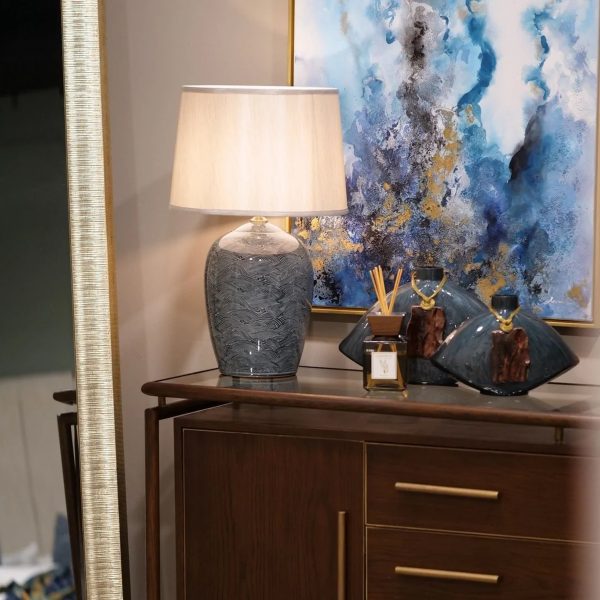 Contemporary abstract framed canvas with waves of monochromatic blues finished with pops of gold.