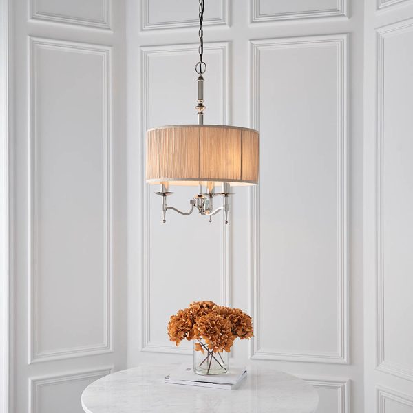 The elegant 3 light pendant from the Stanford nickel range has beautifully curved arms and simple clean detailing. Its complemented by a pretty, beige organza effect shade.