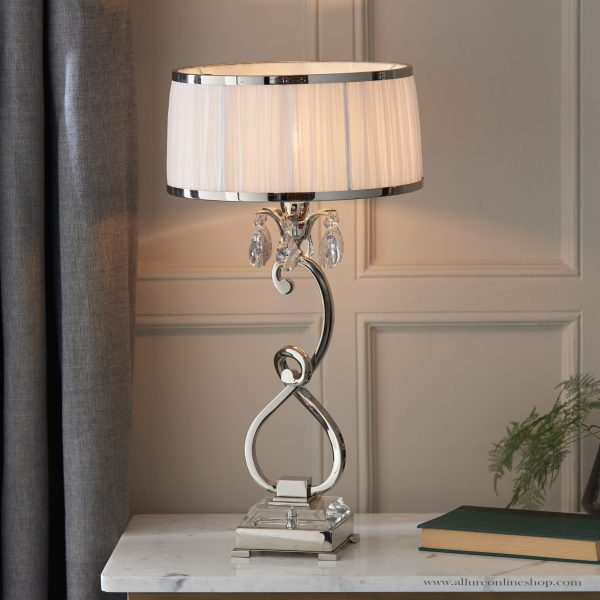 A medium table lamp from the nickel range. Features faceted lead crystal droplets, a decorative stem base and a white pleated shade with a polished nickel trim. Matching items available and compatible with LED lamps
