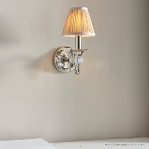 The nickel wall light is an elegant addition to any room. Finished in polished nickel with crystal glass detailing and teamed with a beige organza effect shade to give it an opulent feel