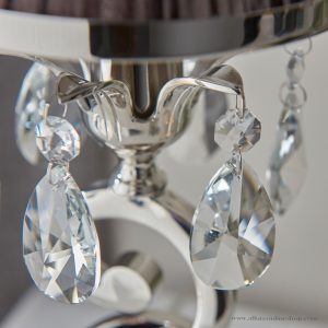 A small table lamp from the nickel range. Features faceted lead crystal droplets, a decorative stem base and a chocolate pleated shade with a polished nickel trim. Matching items available and compatible with LED lamps