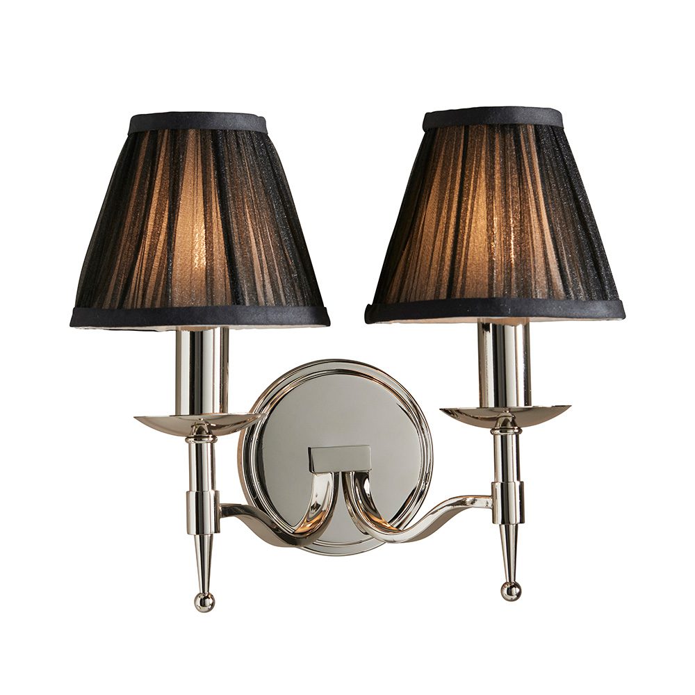 This elegant twin wall light from the Stanford nickel range has beautifully curved arms and simple clean detailing. Its complemented by pretty, black organza effect shades.