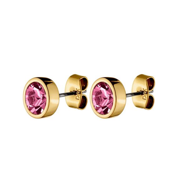 NOBLES – classic solitaire earpost – The center crystal is a facetted crystal set in a modern box setting. Earring made in polished brass with a durable plating. Post is surgical steel – Here shown in golden finish with a rose colored crystal. Approx. 8 mm diameter.