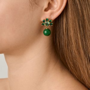 Here shown in gold tone finish fully set with emerald green crystals and a green jade bead.