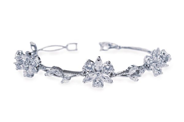 The Waterlily bracelet is a dainty and pretty piece of jewellery. Cut solitaire and marquise man-made diamonds are set in a pattern of flowers and leaves. A gorgeous choice for brides looking for pretty and sparkling accessories.